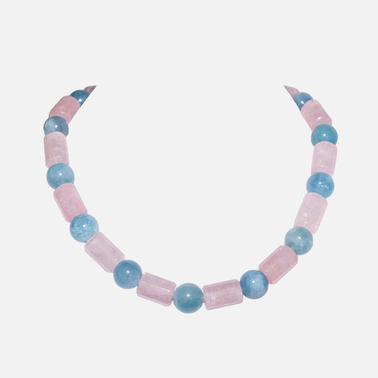Kette aus Rosenquarz & Aquamarin mit vergoldetem Silberverschluss