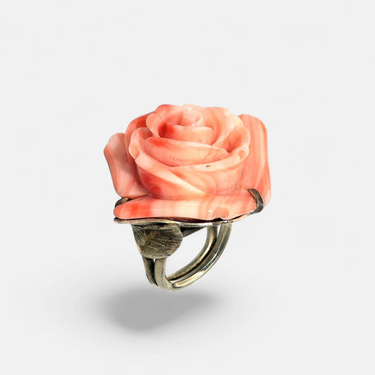 Handgeschnitzter Ring aus Naturkoralle in Rosenform & Silber